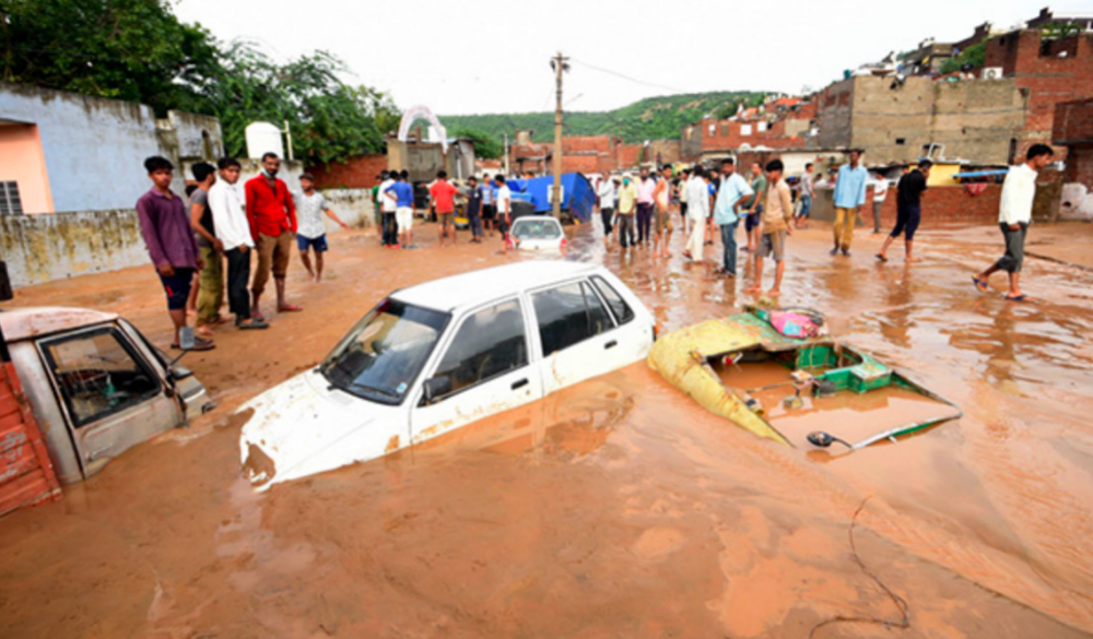 2020年8月14日,在印度拉贾斯坦邦首府斋普尔,一场暴雨过后,雨水冲刷带来的淤泥将街头的车辆埋没。图|新华社