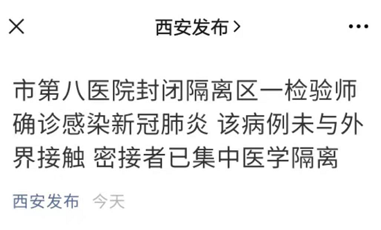 据西安发布微信公众号消息,3月18日凌晨,西安市第八医院隔离区一名检验师确诊为新冠肺炎病例(普通型)。西安市第八医院为省、市两级新冠肺炎患者定点收治医院,该病例自3月4日开始一直在医院隔离区工作。