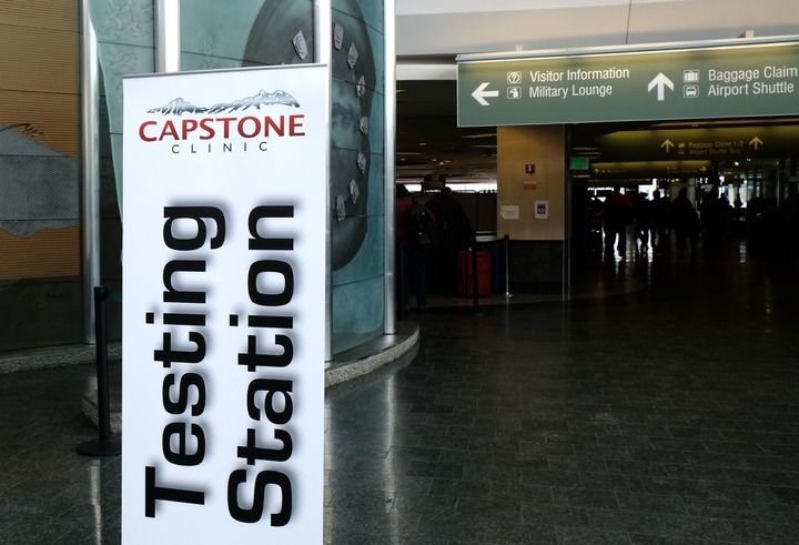 这是3月14日在美国阿拉斯加州安克雷奇机场内拍摄的核酸检测点。新华社记者 吴晓凌 摄