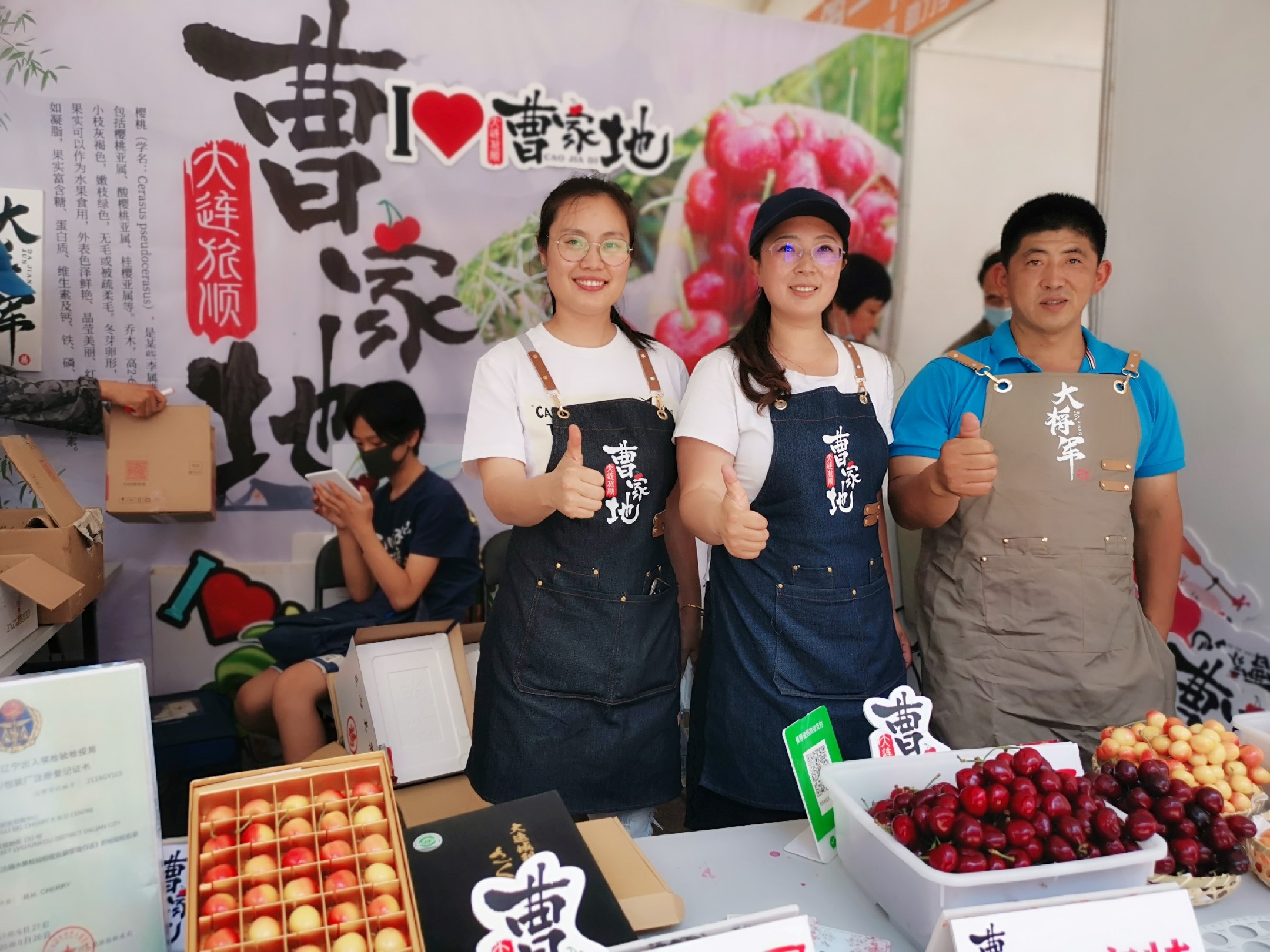 曹艳鹏(中)带着曹家地樱桃参加大连“第一书记农产品展”。受访者供图