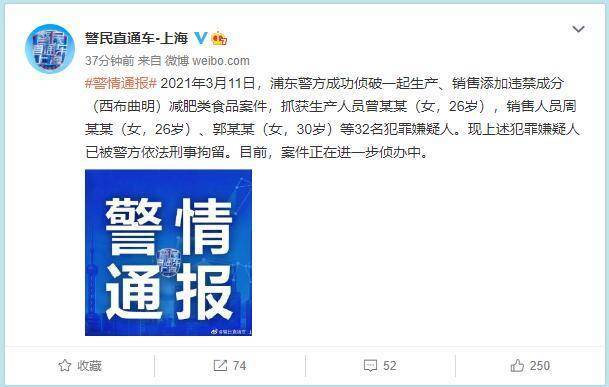 3月18日,澎湃新闻记者从上海浦东警方获悉,2021年3月11日,浦东警方成功侦破一起生产、销售添加违禁成分(西布曲明)减肥类食品案件,抓获生产人员曾某某(女,26岁),销售人员周某某(女,26岁)、郭某某(女,30岁)等32名犯罪嫌疑人。现上述犯罪嫌疑人已被警方依法刑事拘留。目前,案件正在进一步侦办中。