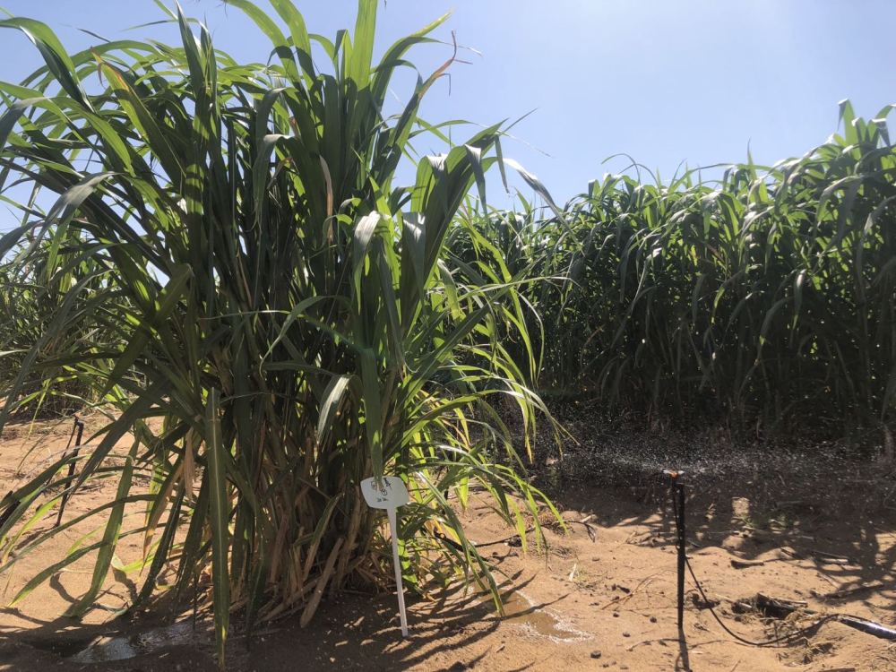 这是2020年8月26日拍摄的乌兰布和沙漠上的菌草治沙示范基地,2米多高的菌草形似玉米,植叶茂密,地下水正通过滴灌毛管不断喷洒在菌草根部。新华社记者安路蒙摄