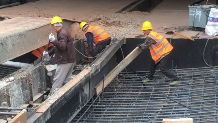 梓潼县掀起交通建设热潮,工人们正加紧施工。