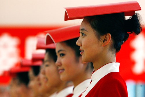 △练习站姿,每名礼仪小姐头上要求顶一本书,保证不能掉下来