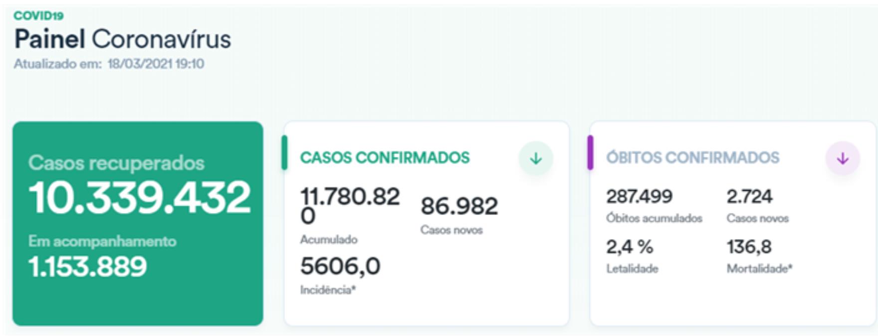 截至当地时间3月18日,据巴西卫生部发布的数据,该国单日新增新冠肺炎确诊病例86982例,累计确诊11780820例;新增死亡病例2724例,累计死亡287499例;累计治愈10339432例。