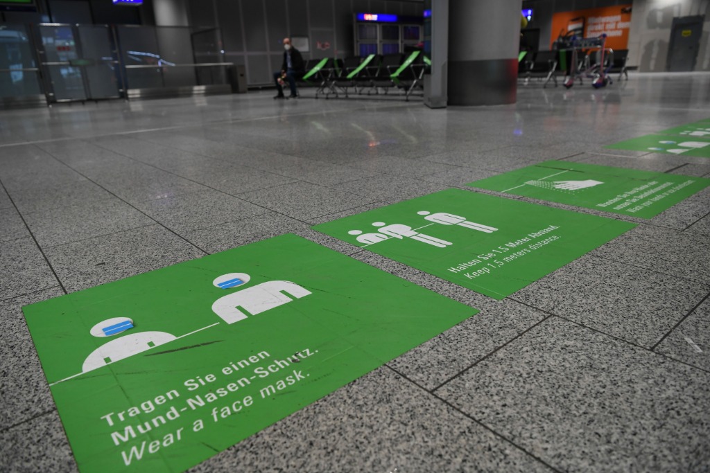 这是3月18日在德国法兰克福机场拍摄的防疫宣传标志。(新华社记者逯阳摄)