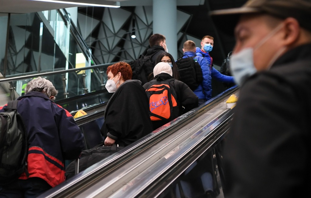 3月18日,在德国法兰克福机场,戴口罩的人们乘扶梯上行。新华社记者逯阳摄