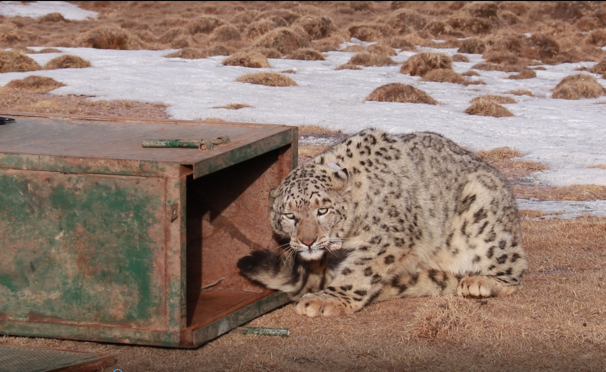 3月16日,雪豹“凌蛰”在野外走出运转笼。 受访者供图
