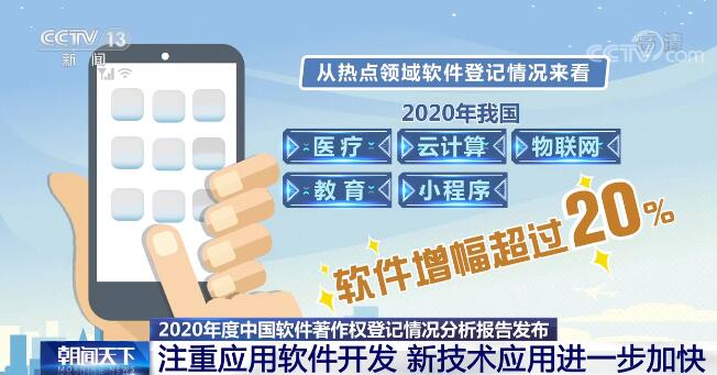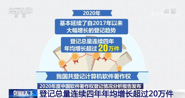 央视网消息:中国版权保护中心昨天(3月18日)正式发布了《2020年度中国软件著作权登记情况分析报告》。报告显示,2020年,我国在科技创新方面抓住了科技创新发展、推动产业优化升级的新机遇,实现了软件著作权登记总量连续四年年均增长超过20万件。