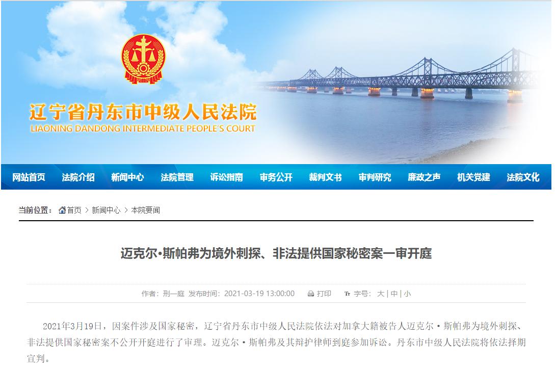 据辽宁省丹东市中级人民法院官方网站发布的消息,2021年3月19日,因案件涉及国家秘密,辽宁省丹东市中级人民法院依法对加拿大籍被告人迈克尔·斯帕弗为境外刺探、非法提供国家秘密案不公开开庭进行了审理。迈克尔·斯帕弗及其辩护律师到庭参加诉讼。丹东市中级人民法院将依法择期宣判。