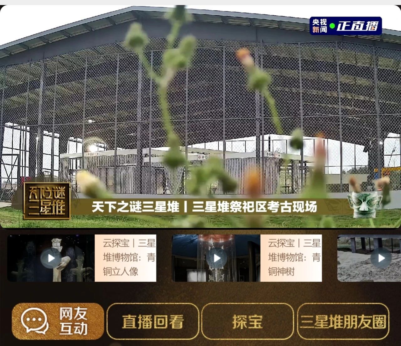 △3月17日起,央视新闻客户端、央视新闻微博、抖音等官方账号推出《天下之谜三星堆》特别板块。VR探宝、虚拟考古小游戏、H5,让你亲临现场;慢直播、微视频、专题报道,一网打尽你想了解的三星堆一切。更有“三星堆朋友圈”,让你了解直播以外的花絮与揭秘,认识更多有趣的灵魂。