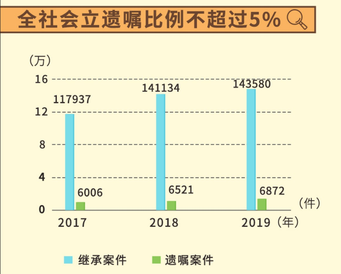 尽管如此,中华遗嘱库管委会主任陈凯认为,目前中国的遗嘱普及率仍然处于非常低的水平。从国家统计局公布的数据看,相比于全国法院2017年到2019年一审继承案件收案数117937件、141134件和143580件,其中遗嘱案件分别为6006件、6521件和6872 件,立遗嘱比例不足5%。