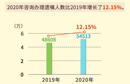 中华遗嘱库今天(3月19日)正式向社会发布了《2020中华遗嘱库白皮书》,截至2020年底,中华遗嘱库已向社会提供遗嘱咨询25.6万人次,登记保管了19万份遗嘱,目前已生效遗嘱共计954份。2020年受疫情影响,中华遗嘱库暂停线下服务两个月,但全年遗嘱咨询办理的数量不但未受到负面影响,反而出现了一定比例的增长。从数据上看,2020年咨询办理遗嘱人数比2019年增长了12.15%。
