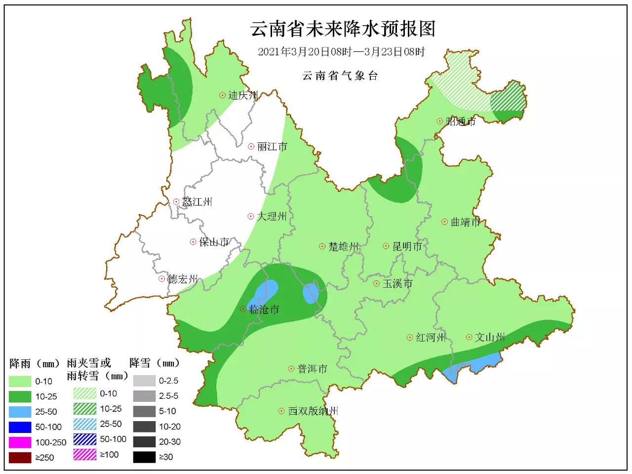 据预报,3月20日,文山南部、红河东南部阴天间多云有小雨局部中雨,昭通北部、曲靖东部、文山北部、怒江北部、迪庆西部多云间阴局部有阵雨,其中昭通北部高海拔地区有雨夹雪;21日,文山、红河、玉溪南部、普洱东部、西双版纳东部、怒江北部、迪庆西部阴有小雨局部中雨,昭通、曲靖、昆明、玉溪北部、楚雄东部阴有零星小雨;22日,普洱西部和北部、临沧南部阴有小到中雨,昭通、曲靖、昆明北部、楚雄、玉溪西部、红河西部、西双版纳、普洱东部、临沧北部、大理东部、丽江东部、迪庆西部、怒江阴天间多云有小雨局部有中雨,其它地区多云。