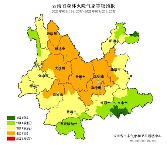 雨水的到来将有利于降低滇中及以东以南地区的森林火险气象等级,但滇西北南部、滇西大部无明显降水,仍会维持高森林火险气象等级,需加强防范。预计未来24小时,迪庆东部、丽江、大理大部、临沧北部、普洱北部、楚雄、昆明、玉溪、曲靖西部森林火险气象等级为4级(高),迪庆西部、怒江东部和南部、大理西南部、保山、德宏、临沧南部、普洱大部、红河北部、曲靖中部和南部、昭通南部为3级(较高),其它地区1~2级(较低)。