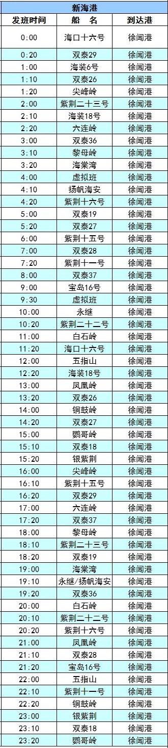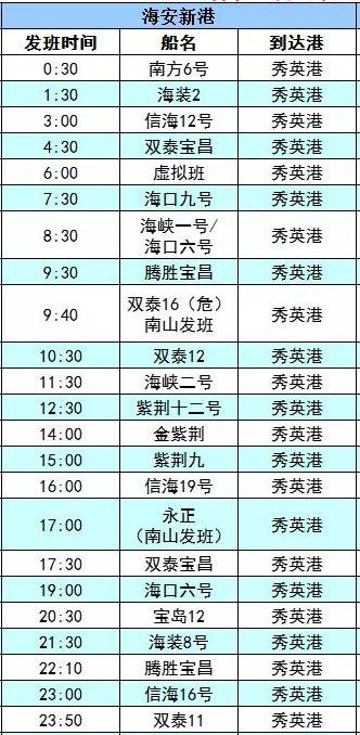 据介绍,海口至海安,新海港始发至徐闻港海上航行时间约60分钟;秀英港始发至海安新港海上航行时间约90分钟。海安至海口,徐闻港始发至新海港海上航行时间约60分钟;海安新港始发至秀英港海上航行时间约90分钟。