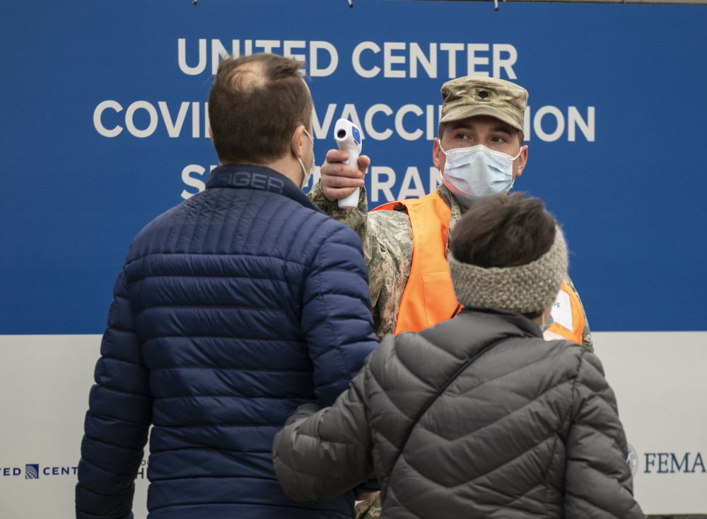 3月10日,在美国芝加哥,一名男子在进入联合中心球场新冠疫苗接种点前测量体温。(新华社发,乔尔·莱纳摄)