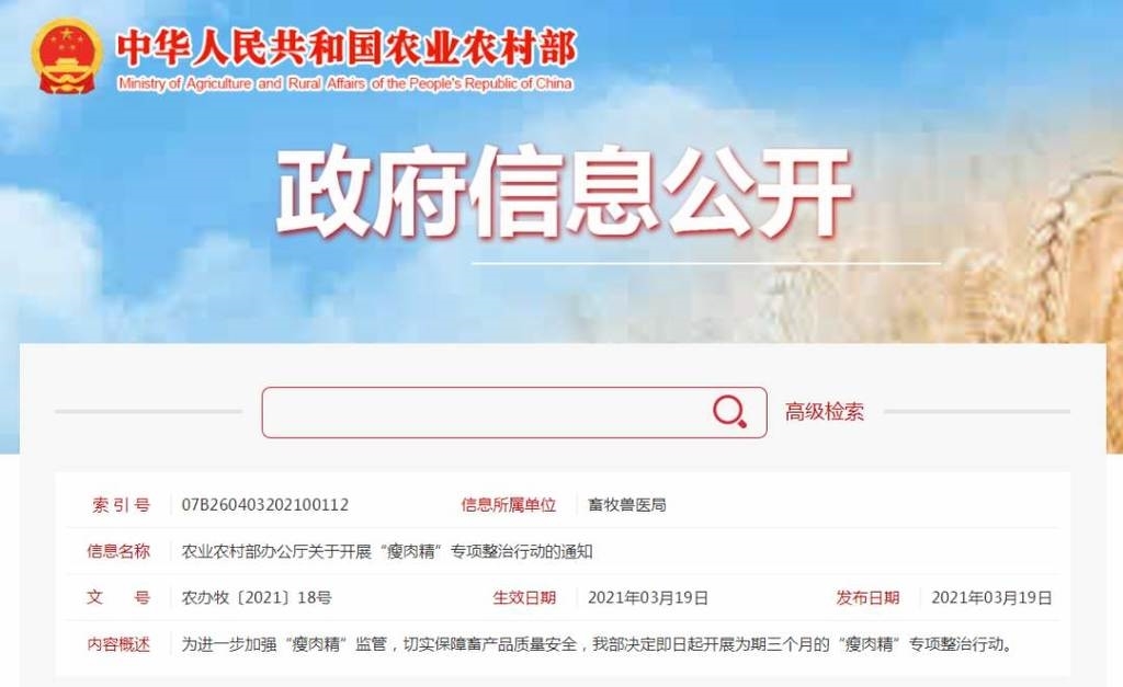 农业农村部官网3月19日消息,农业农村部办公厅发布《关于开展“瘦肉精”专项整治行动的通知》:为进一步加强“瘦肉精”监管,切实保障畜产品质量安全,农业农村部决定即日起开展为期三个月的“瘦肉精”专项整治行动。
