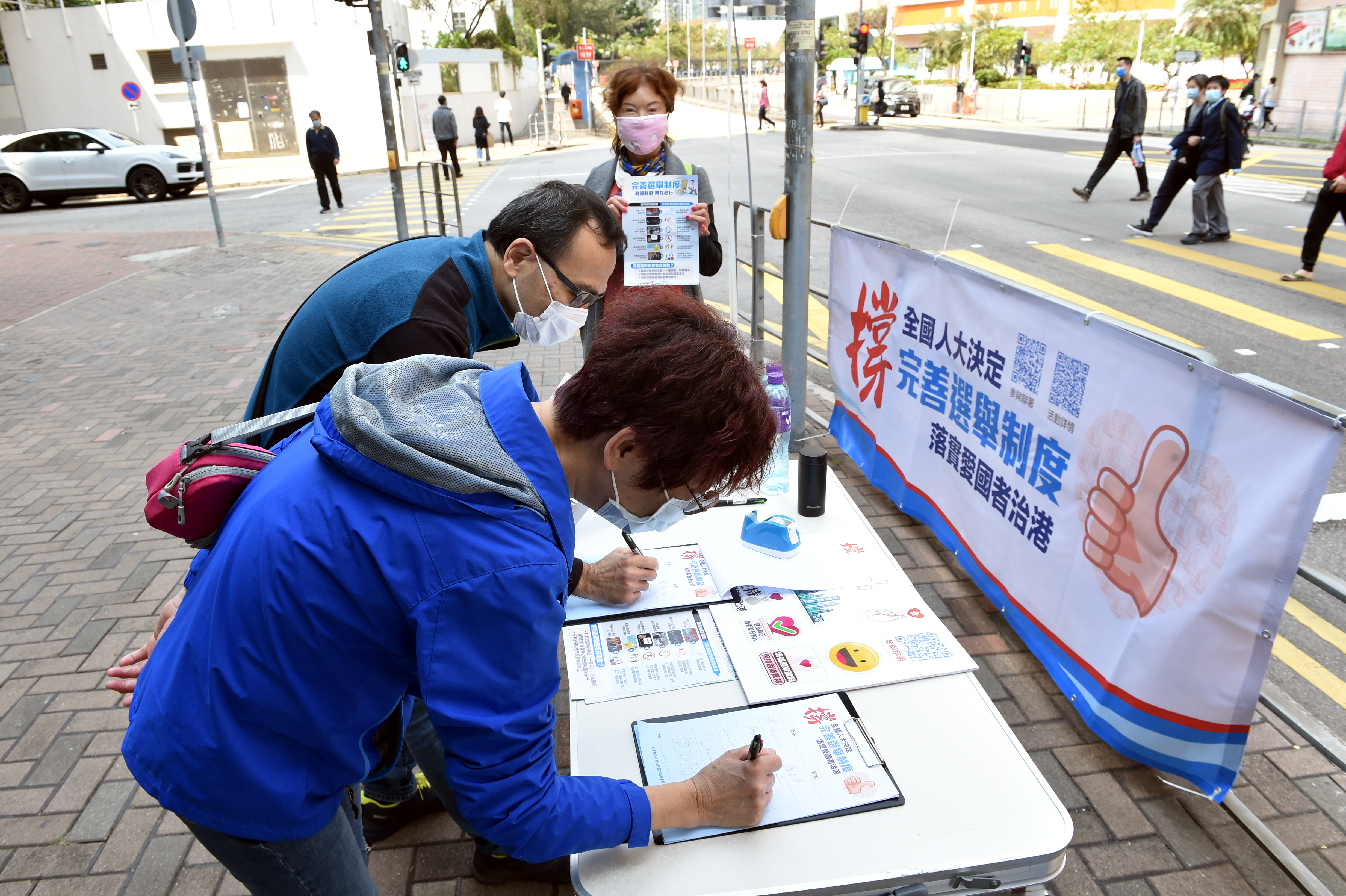 3月11日,在香港街头,香港市民签名支持全国人大完善香港选举制度决定。 新华社记者 卢炳辉 摄