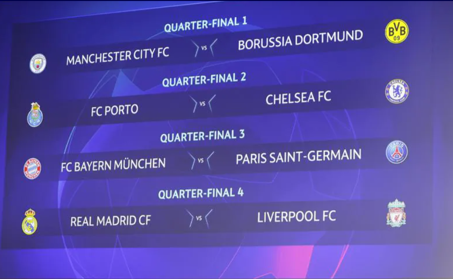 另外两场对决分别是曼城迎战多特蒙德;切尔西对阵波尔图。八强战首回合于4月6日和7日上演,第二回合在4月13日和14日进行。半决赛两回合计划于4月27和28日、5月4日和5日展开。决赛将于5月29日在土耳其伊斯坦布尔打响。