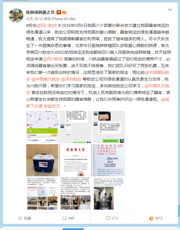 此前,认证为“无锡市人民医院副院长”的微博用户@陈静瑜肺腑之言19日在微博发文称,当天,一个由北京中日医院肺移植团队获取的爱心捐献肺源须从北京乘坐四川航空3U8882航班运输到四川省成都市,完成肺移植。团队在昨天(3月18日)依规向四川航空报备时被告知,前述器官箱超过规定携带尺寸,须给器官箱另购机票,否则无法报备。
