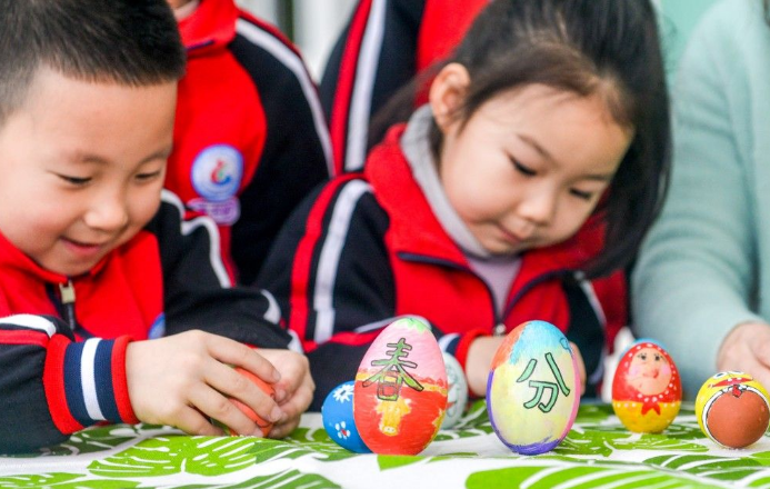 小朋友们在玩“春分立蛋”游戏。