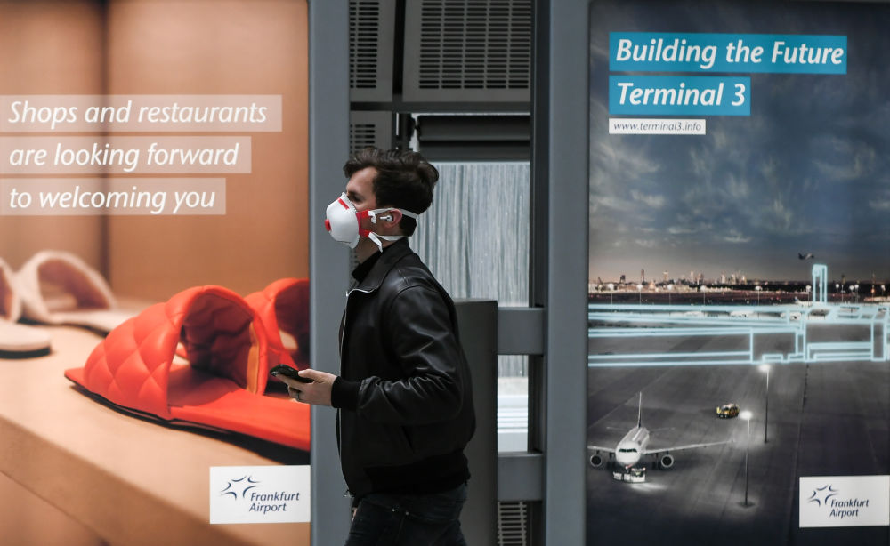 3月18日,在德国法兰克福机场,一名戴口罩的男子从广告牌前走过。德国疾控机构罗伯特·科赫研究所当日发布的数据显示,德国较前一日新增新冠确诊病例17504例,累计确诊病例超过261万例。这一单日增幅为德国今年1月22日以来最高水平。(新华社记者逯阳摄)