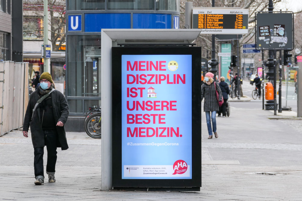 3月12日,在德国首都柏林,一名行人经过写有“我的纪律是我们最好的药物”字样的广告牌。(新华社发,斯特凡·蔡茨摄)