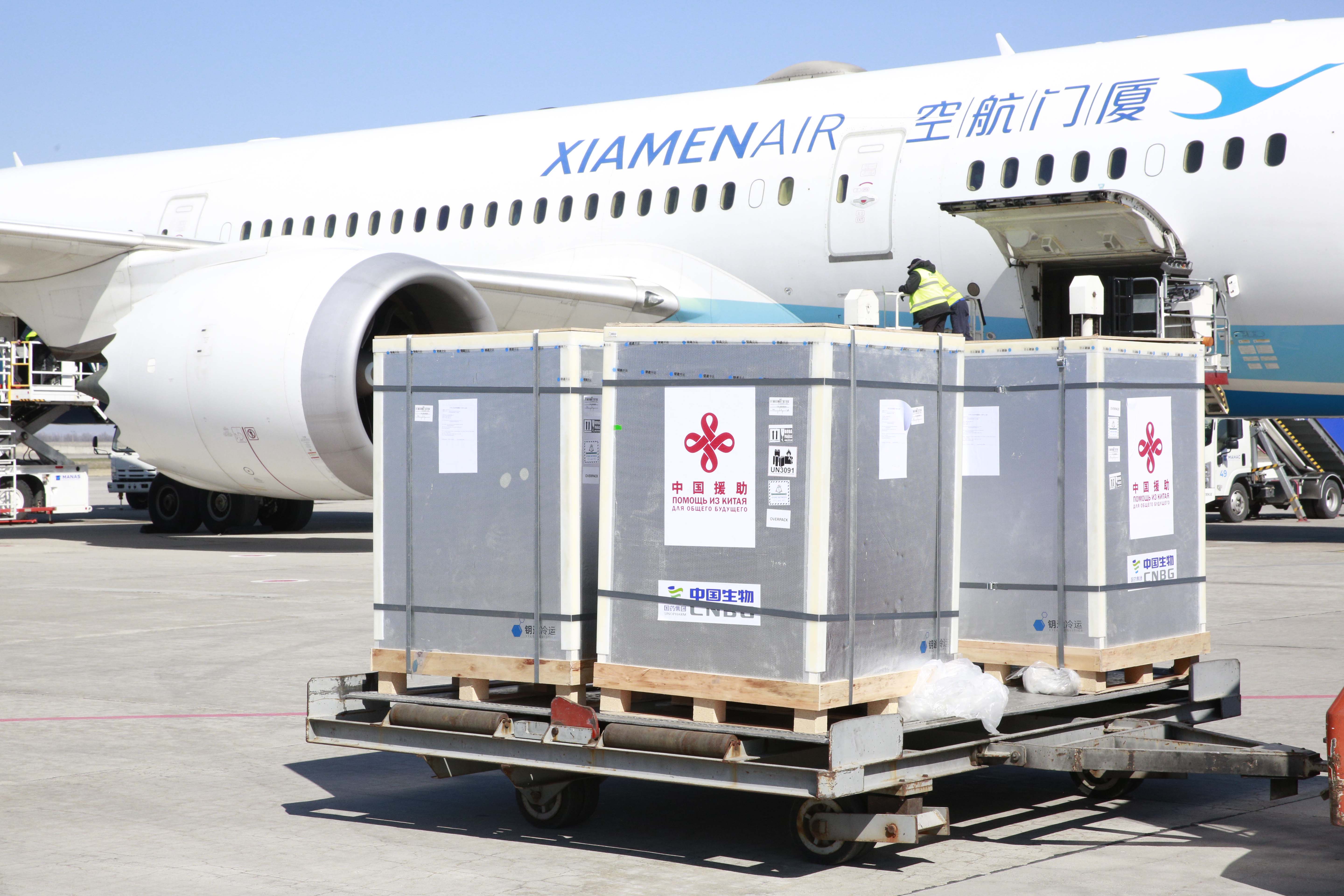 3月19日,在吉尔吉斯斯坦比什凯克玛纳斯国际机场,工人转运新冠疫苗。(新华社发,罗曼摄)