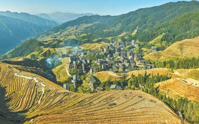在龙脊山下的大寨村,山村梯田把山寨层层围揽,小山上新建的楼房藏在了林中。一道溪水从村中穿过,马路从村中心斜伸向山上。两旁的木楼檐下红灯笼悬挂,都是餐馆、客栈、酒店、民宿,太阳能路灯沿街竖立。村委会门前的平坝上一片金黄,那是村民摊开一张张竹席在晾晒稻谷。