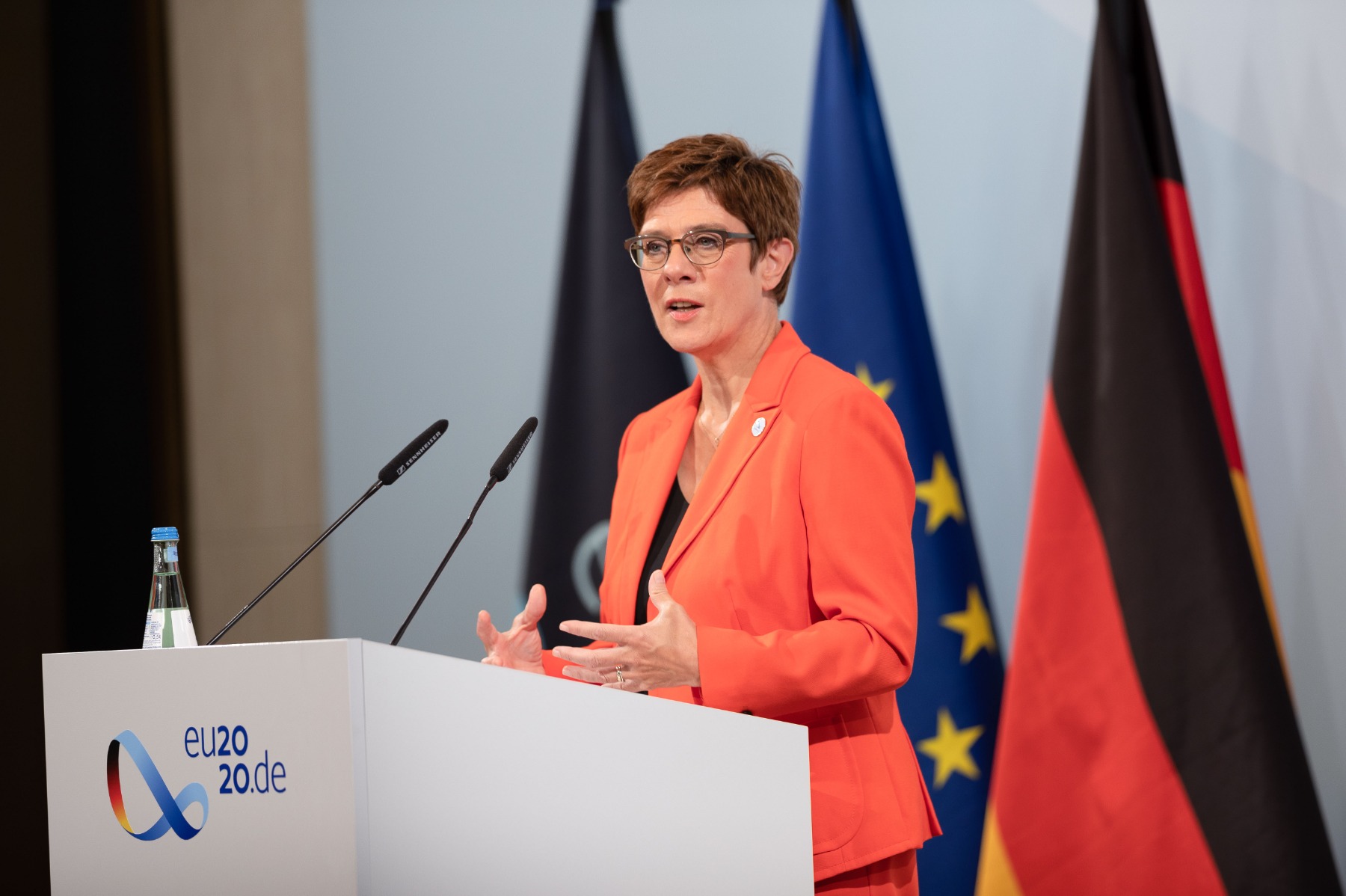 2020年8月26日,在德国首都柏林,德国国防部长克兰普-卡伦鲍尔出席欧盟国防部长非正式会议后的新闻发布会。(新华社发,德国联邦国防军供图)