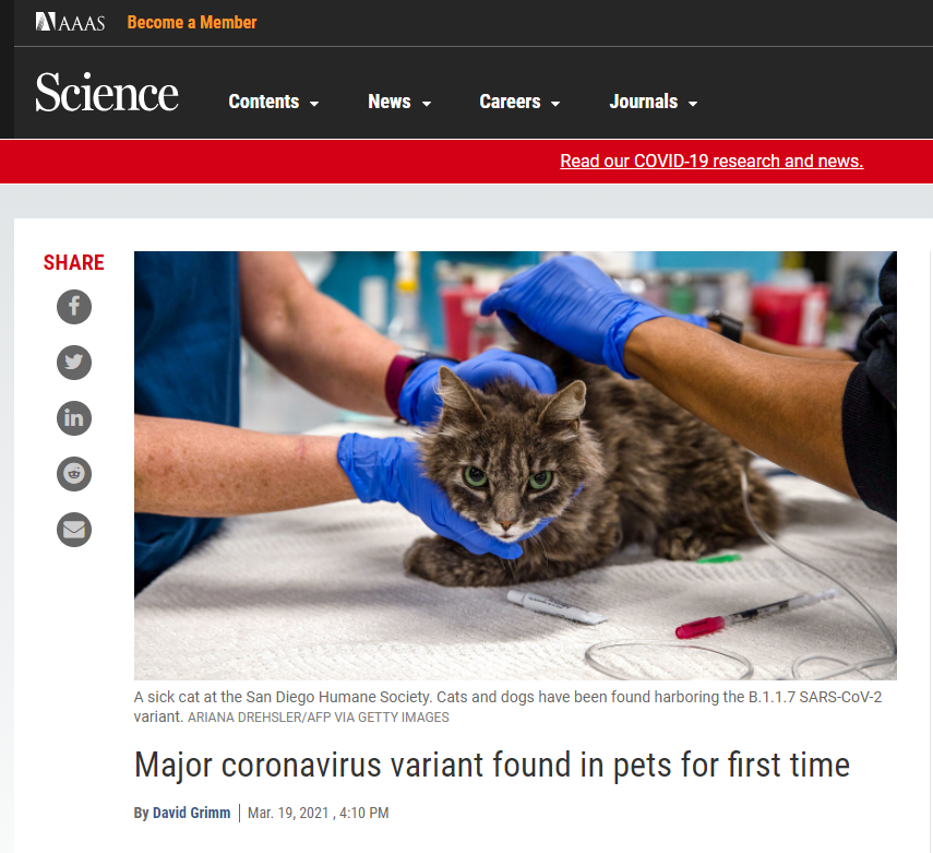 据美国《科学》杂志19日报道,美国和法国研究人员近日发布两份报告称,他们首次发现了狗和猫感染新冠病毒变异毒株B.1.1.7的证据,这是科学家首次在人体之外发现这种变异毒株。
