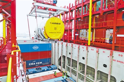 在德国汉堡港内,工人们将空客公司汉堡工厂生产的A320飞机大部件吊装到中远海运货轮,并准备运往中国天津。本报记者 李 强摄