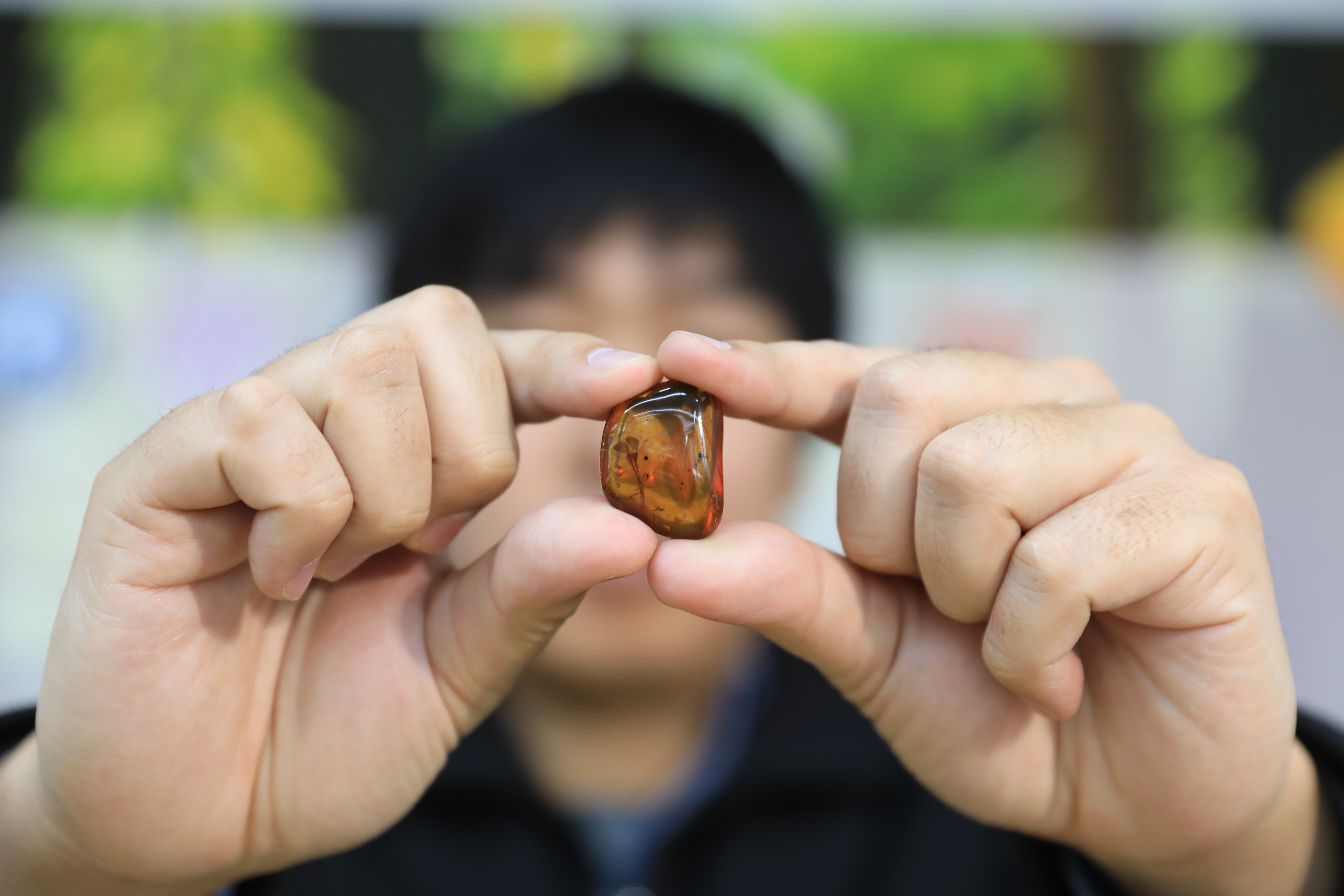 ↑陈睿博士手持“大角蝽”琥珀
