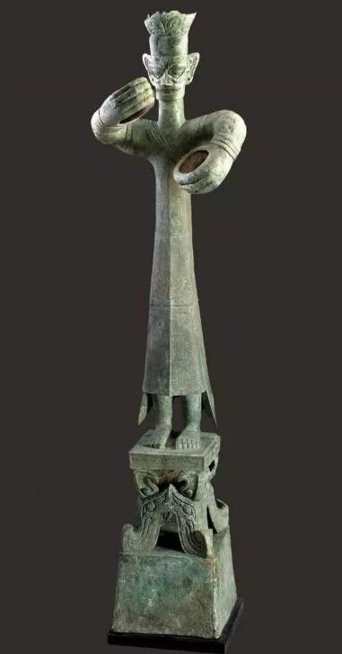 雕像系采用分段浇铸法嵌铸而成,身体中空,分人像和底座两部分。人像头戴高冠,身穿窄袖与半臂式共三层衣,衣上纹饰繁复精丽,以龙纹为主,辅配鸟纹、虫纹和目纹等,身佩方格纹带饰,制作之精美细腻,迄今为止,在夏商周考古史上绝无仅有。其双手手型环握中空,两臂略呈环抱状构势于胸前。脚戴足镯,赤足站立于方形怪兽座上。其整体形象典重庄严,似乎表现的是一个具有通天异禀、神威赫赫的大人物正在作法。