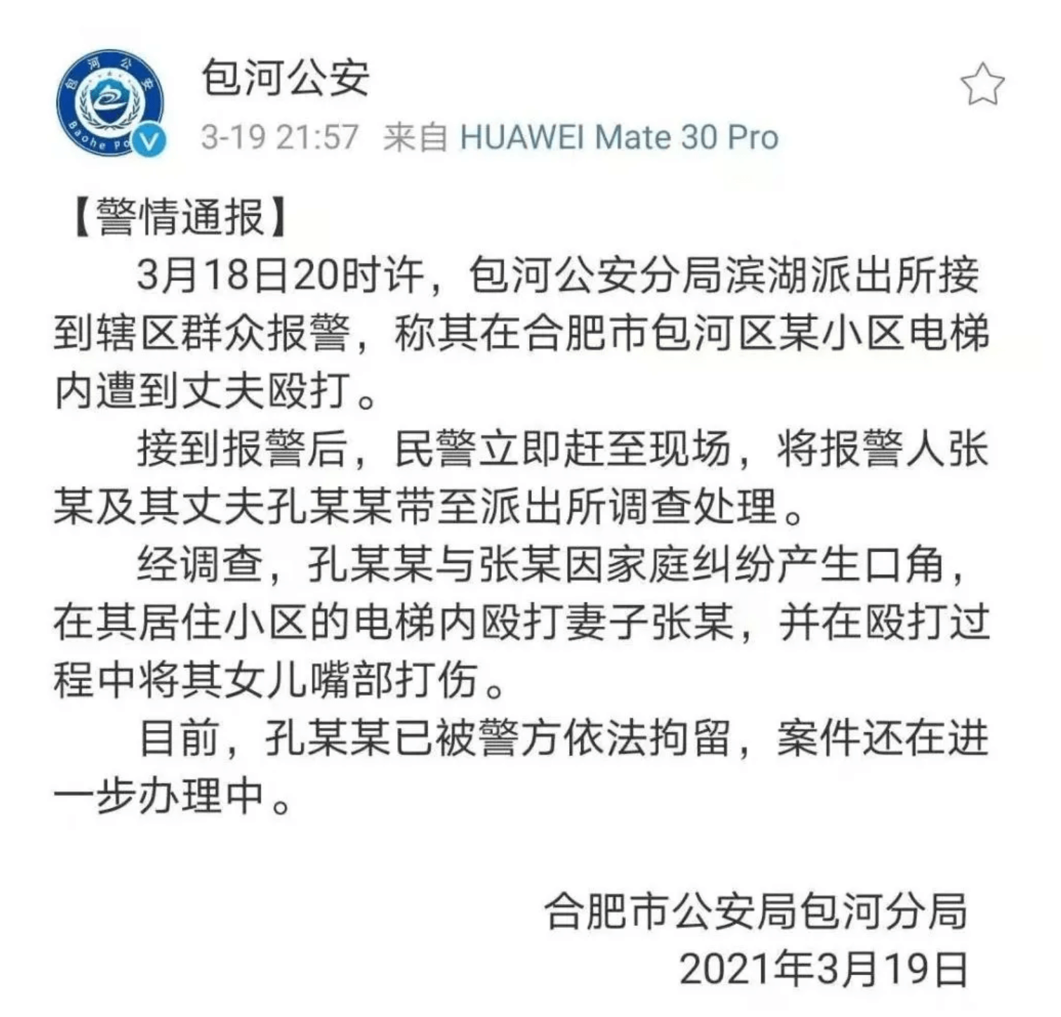 针对此事,合肥包河警方发布通报,称施暴男子与被打女子为夫妻关系,目前已将施暴男子孔某某依法拘留。