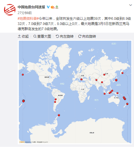今年以来,全球共发生六级以上地震39次,其中6.0级到6.9级32次,7.0级到7.9级7次,8.0级以上0次,最大地震是3月5日在新西兰克马德克群岛发生的7.8级地震。