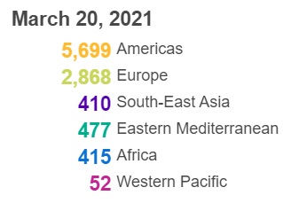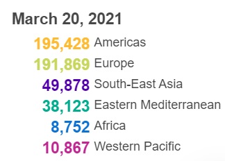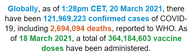 根据世卫组织最新实时统计数据,截至欧洲中部时间3月20日13时28分(北京时间3月20日20时28分),全球累计新冠肺炎确诊病例121969223例,累计死亡病例2694094例。20日全球新冠肺炎确诊病例新增494917例,死亡病例新增9921例。