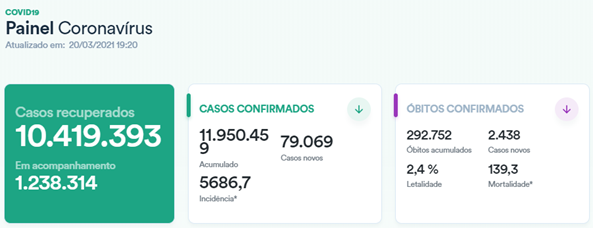 截至当地时间3月20日,据巴西卫生部发布的数据,该国单日新增新冠肺炎确诊病例79069例,累计确诊病例达到11950459例;新增死亡病例2438例,累计死亡病例292752例;累计治愈病例10419393例。