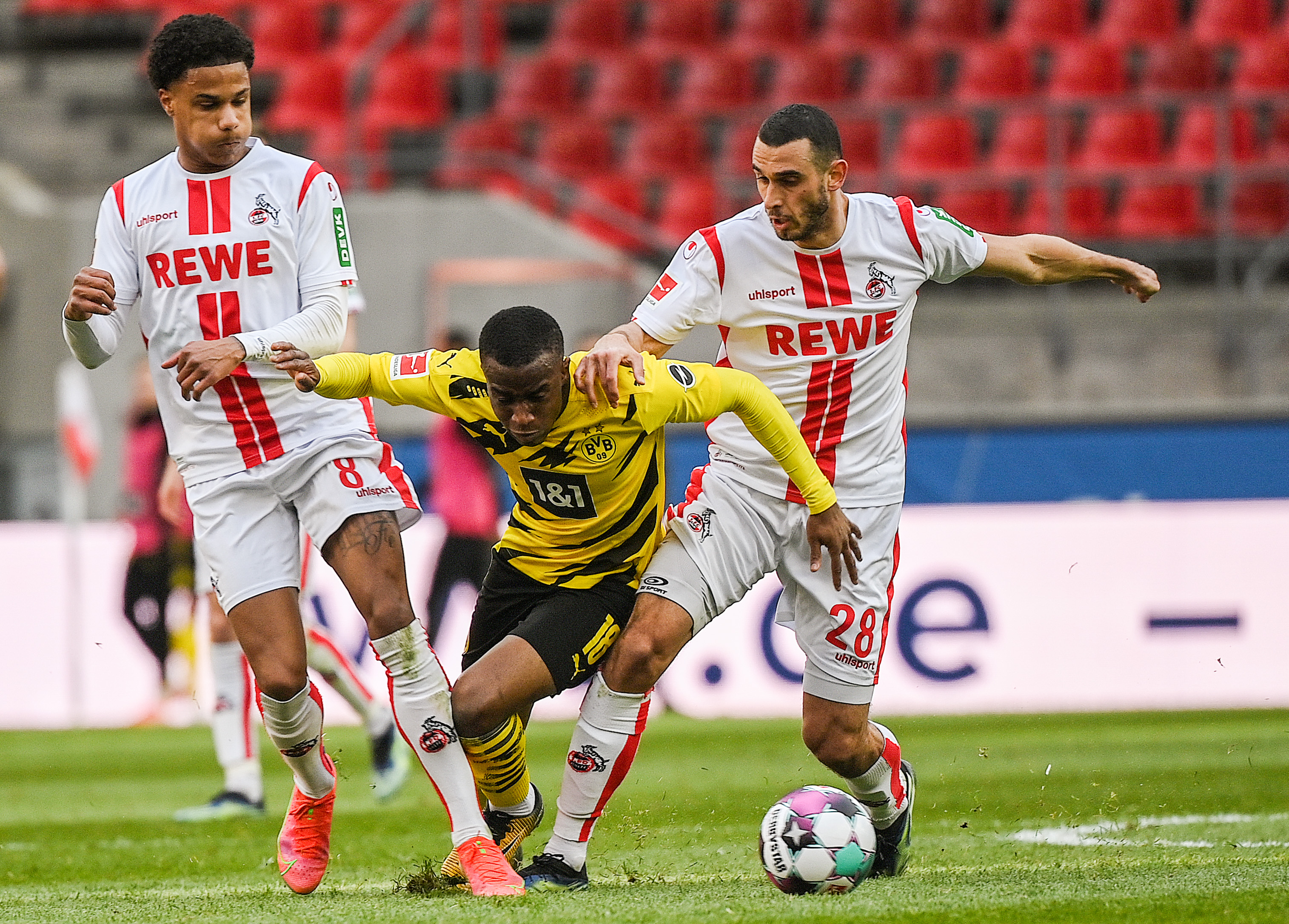 3月20日,多特蒙德队球员穆科科(中)与科隆队球员雅各布斯(左)、斯希里在比赛中拼抢。新华社发(乌尔里希·胡夫纳格尔摄)