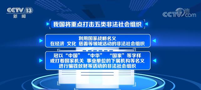 这次要重点打击的五类非法社会组织包括,一是利用国家战略名义,在经济、文化、慈善等领域活动的非法社会组织;二是冠以“中国”“中华”“国家”等字样,或打着国家机关、事业单位的下属机构等名义,进行骗钱敛财等活动的非法社会组织;三是与合法登记的社会组织勾连开展活动、鱼目混珠的非法社会组织;四是借庆祝中国共产党建党100周年活动开展评选评奖活动的非法社会组织;五是开展伪健康类、伪国学类和神秘主义类活动,以及假借宗教旗号活动的非法社会组织。