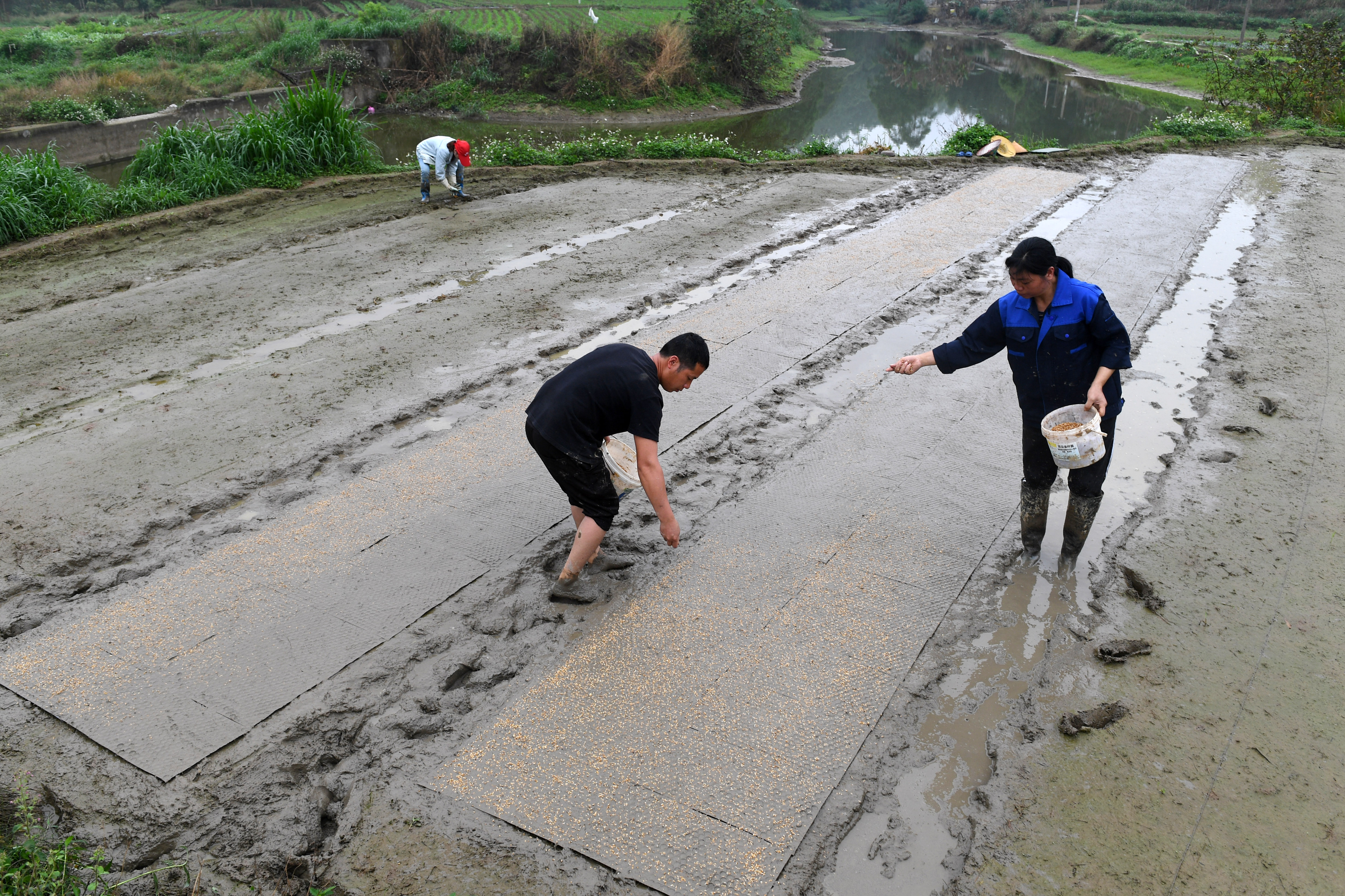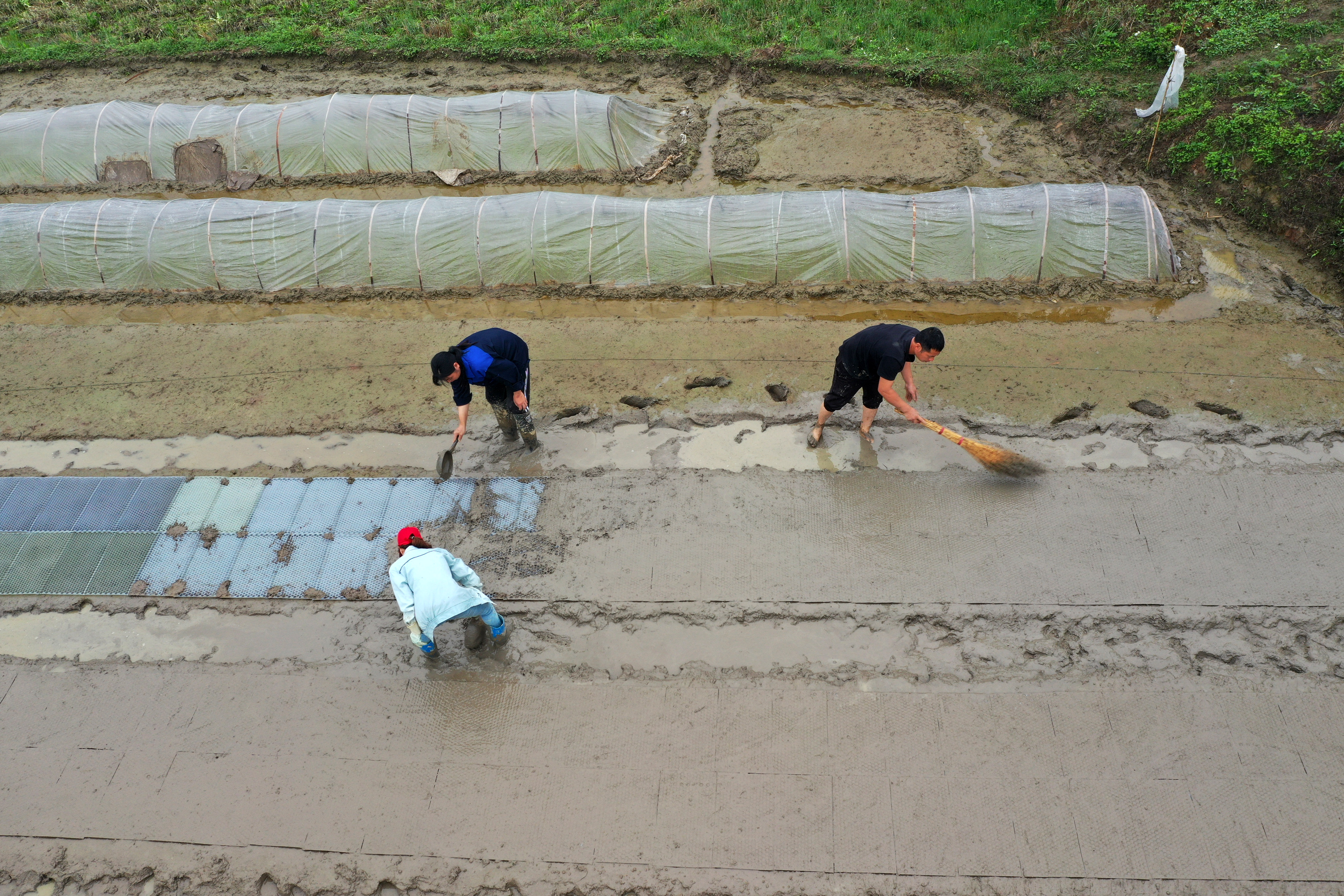 ↑在广西来宾市兴宾区三五镇古炼村,蒋永诚(右一)在田间将秧盘上的泥扫平准备撒谷种(无人机照片,3月20日摄)。