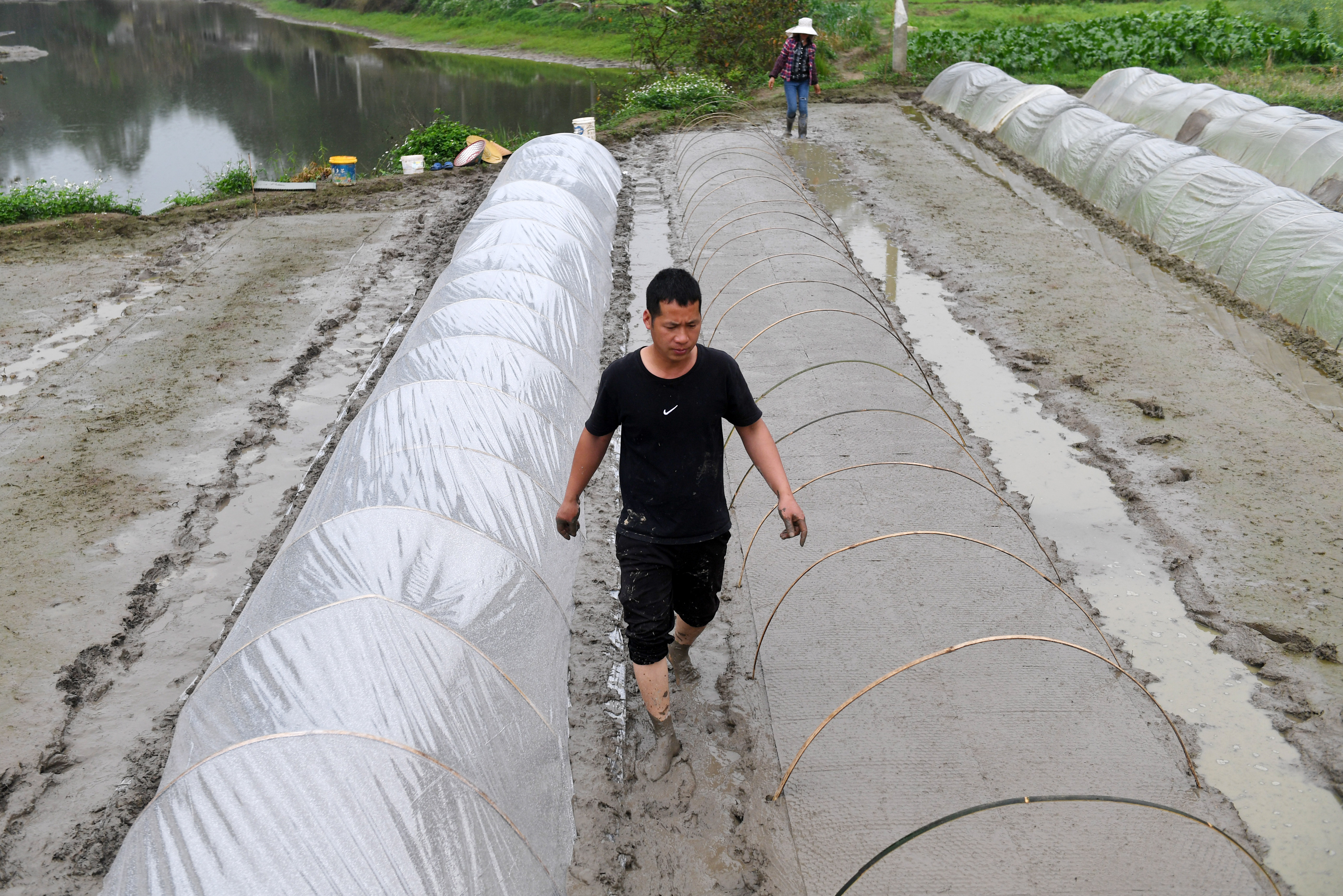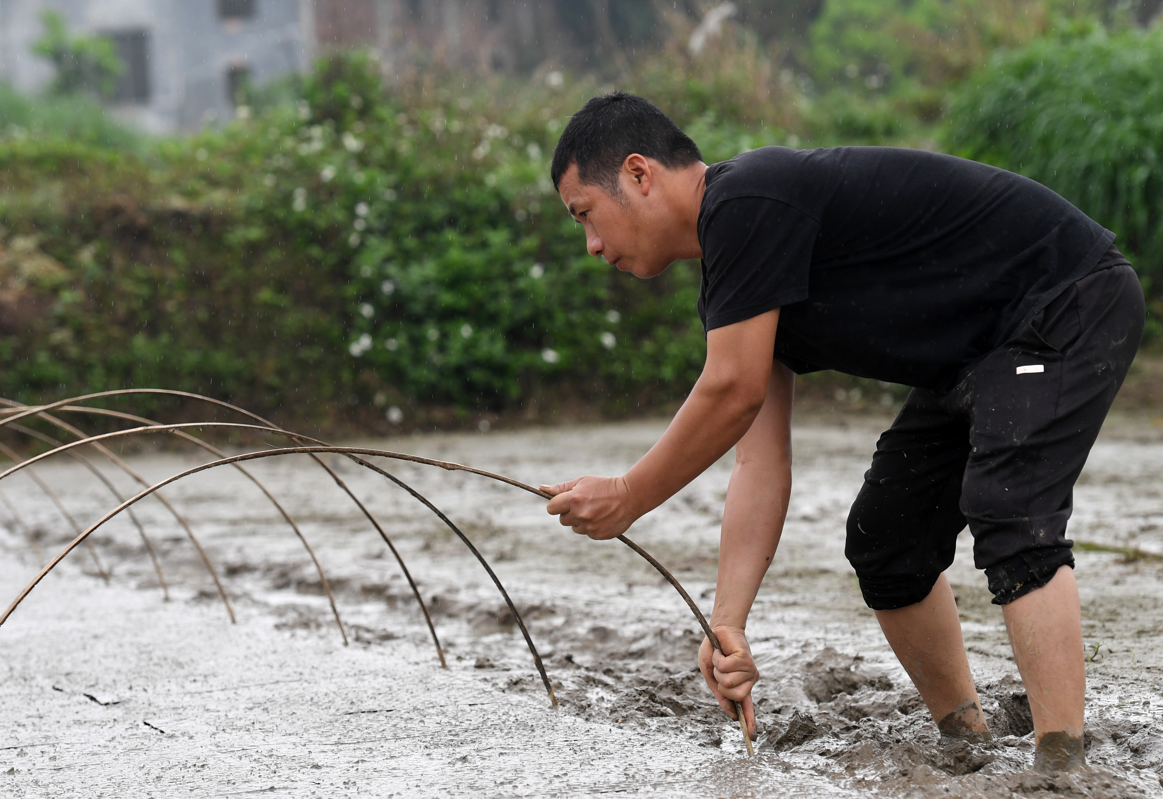 ↑在广西来宾市兴宾区三五镇古炼村,蒋永诚在田间插竹片准备盖薄膜育秧(3月20日摄)。