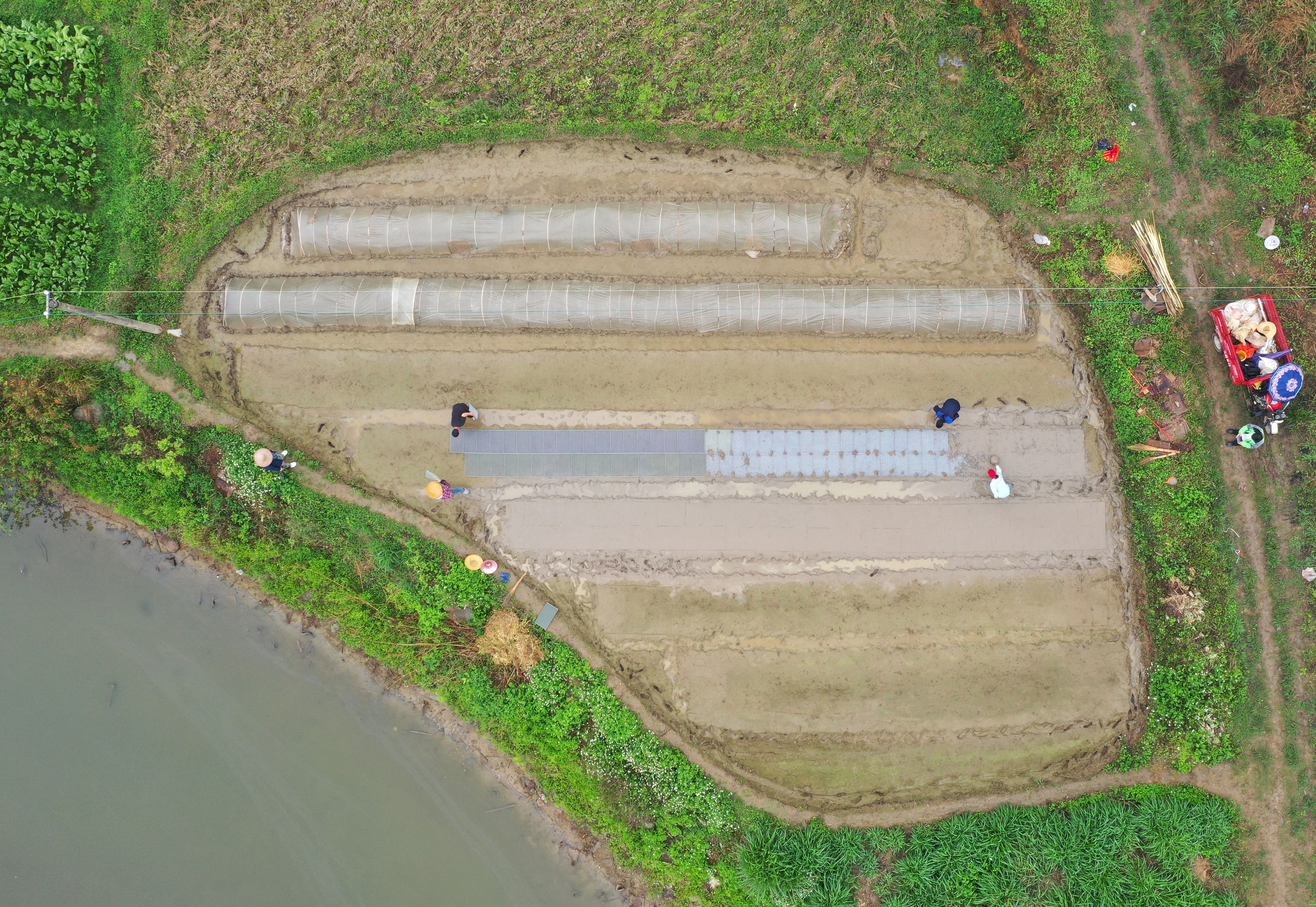 ↑在广西来宾市兴宾区三五镇古炼村,蒋永诚(上排左一)在田间摆放秧盘准备育秧(无人机照片,3月20日摄)。