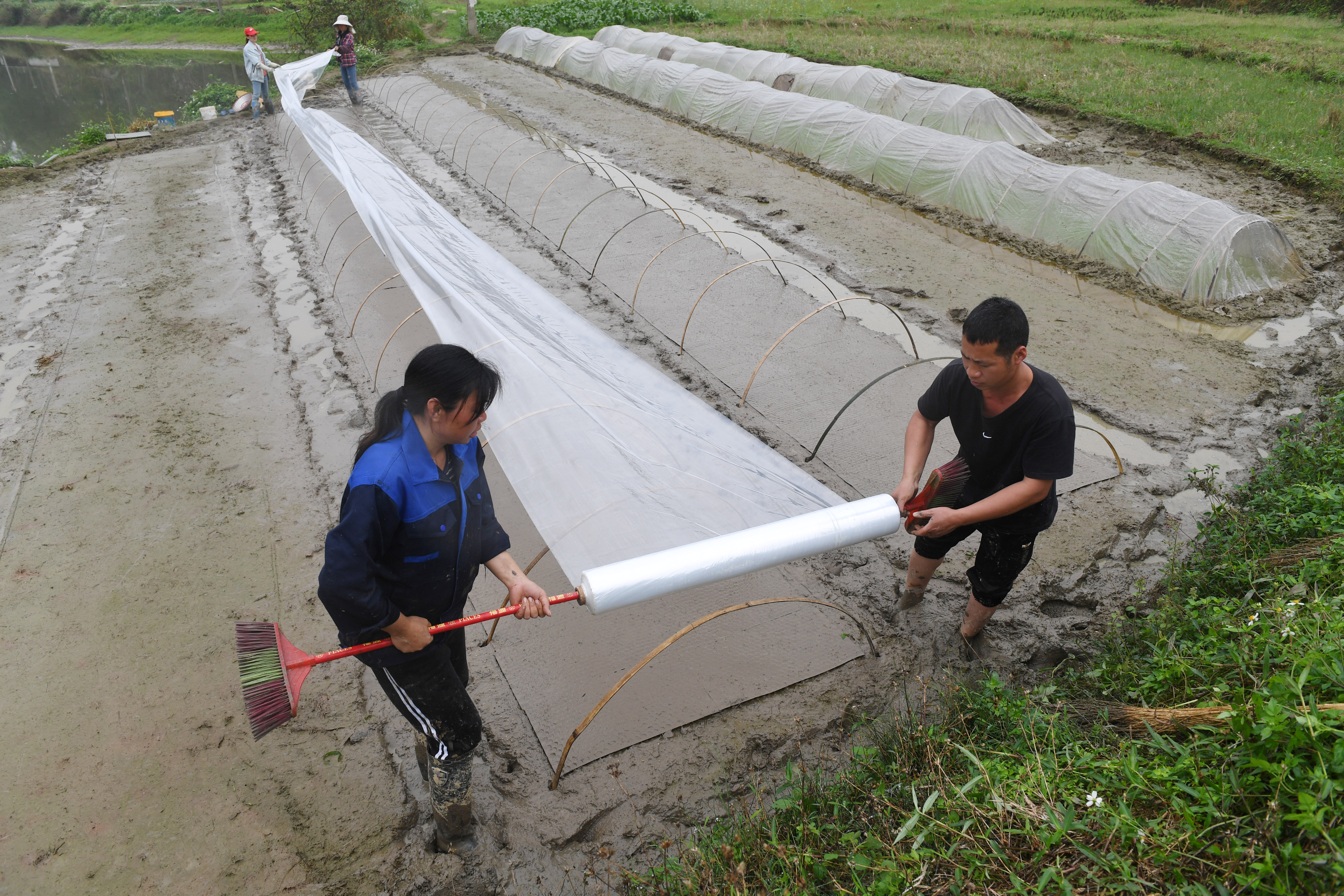 ↑在广西来宾市兴宾区三五镇古炼村,蒋永诚(右一)和爱人莫莉江(右二)在田间盖薄膜育秧(3月20日摄)。