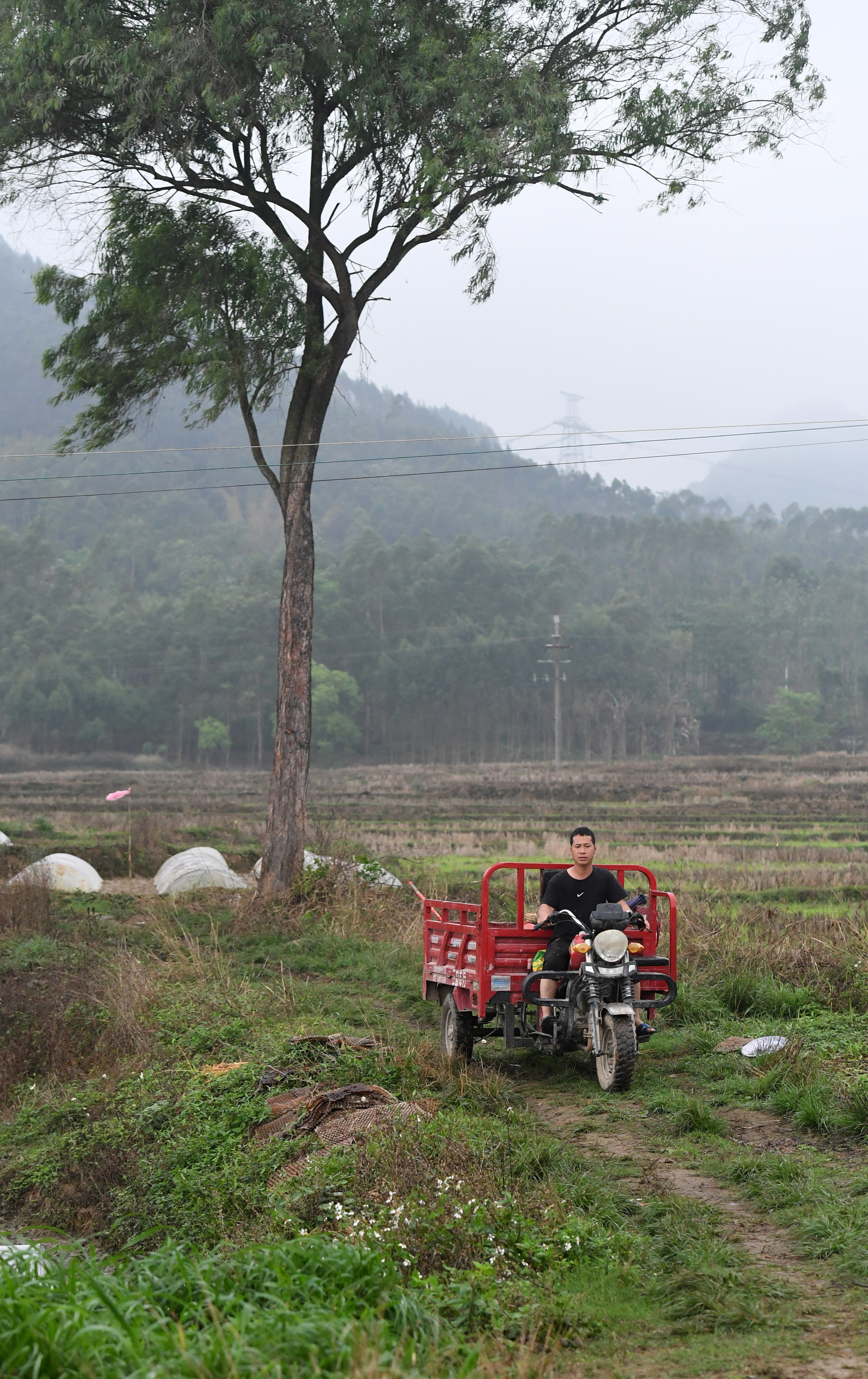 ↑在广西来宾市兴宾区三五镇古炼村,蒋永诚育秧收工后骑三轮车回家(3月20日摄)。