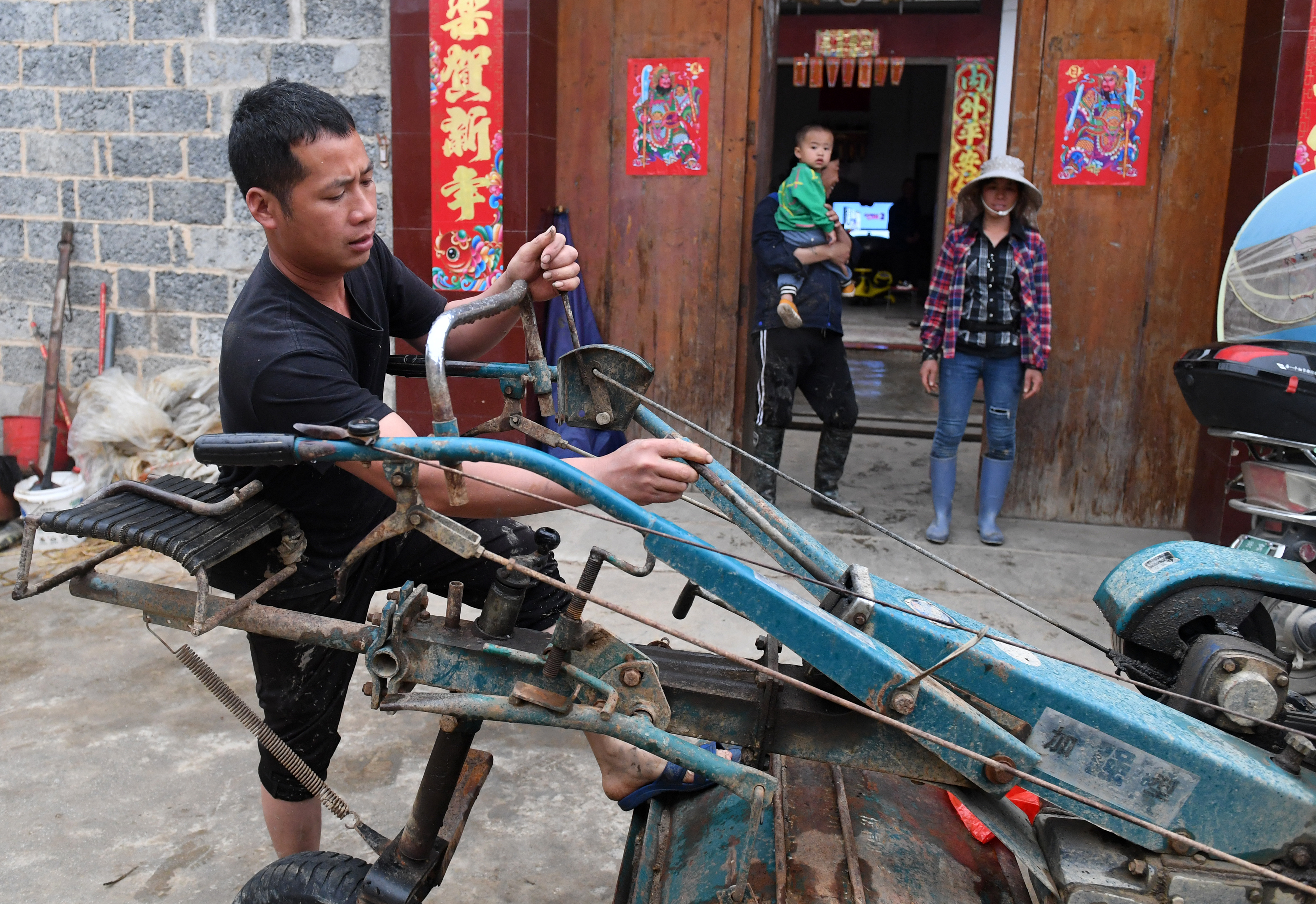 ↑在广西来宾市兴宾区三五镇古炼村,蒋永诚在家门口检修农机(3月20日摄)。