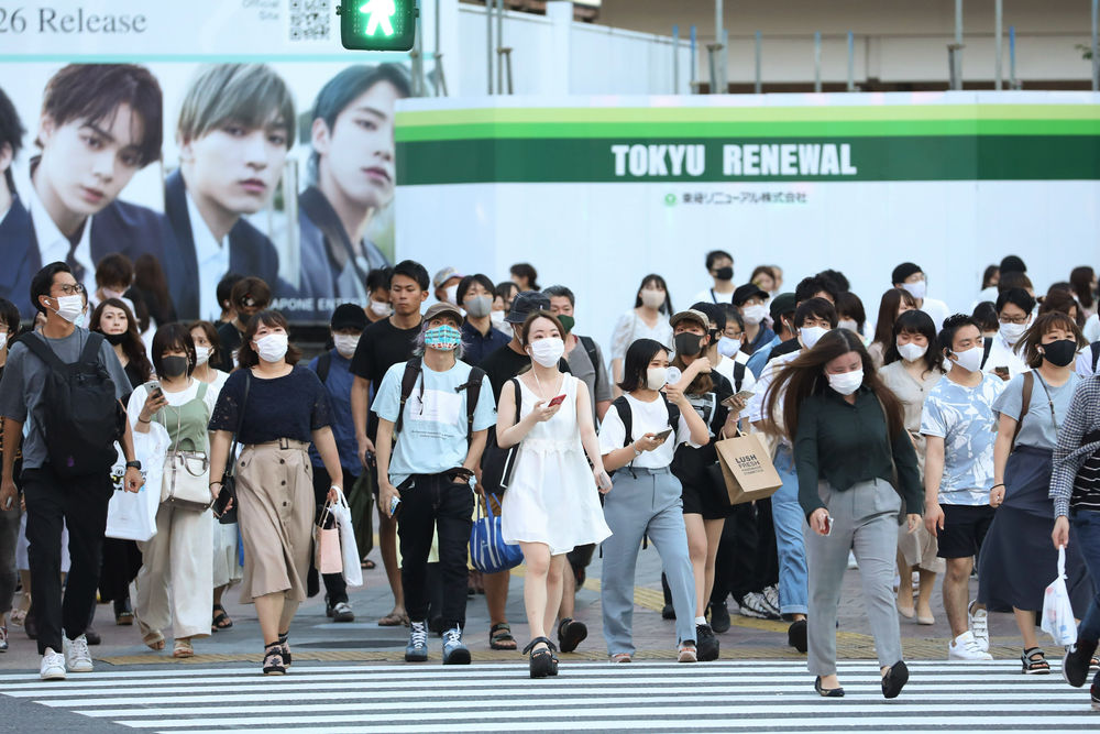 2020年8月20日,在日本东京,行人戴口罩走在涩谷街头。(新华社记者杜潇逸摄)