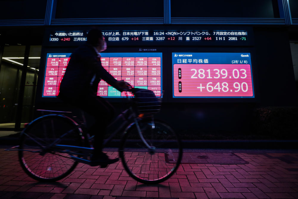 2021年1月8日,行人骑行经过日本东京街头的一处电子股指显示屏。(新华社记者杜潇逸摄)