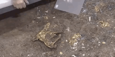 这半张面具宽约23厘米,高约28厘米,含金量为85%左右,银含量在13%到14%左右。根据半张面具推测,这件黄金面具的完整重量应该超过500克。